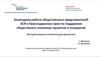 На повестку дня был вынесен вопрос «Командная работа общественных представителей АСИ в Краснодарском крае по поддержке общественно значимых проектов и инициатив».