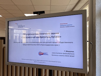 Вниманию участников встречи была предложена инициатива Краснодарской краевой общественной организации Всероссийское общество изобретателей и рационализаторов об учреждении Почетного звания «Заслуженный изобретатель Кубани». С информацией выступил заместитель председателя Краевого совета ВОИР Мишулин Г.М. и представил проект «Положения о Почетном звании».