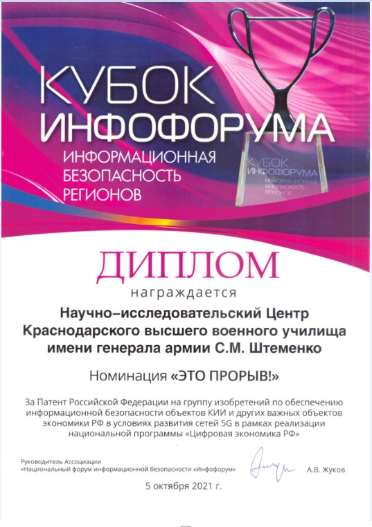 Кубок вручен за патент на группу изобретений по обеспечению информационной безопасности объектов КИИ и других важных объектов экономики РФ в условиях развития сетей 5G в рамках реализации национальной программы «Цифровая экономика РФ» (автор - Краснов Василий Александрович).