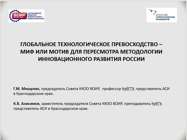 С докладом «ГЛОБАЛЬНОЕ ТЕХНОЛОГИЧЕСКОЕ ПРЕВОСХОДСТВО – МИФ ИЛИ МОТИВ ДЛЯ ПЕРЕСМОТРА МЕТОДОЛОГИИ ИННОВАЦИОННОГО РАЗВИТИЯ РОССИИ», подготовленном совместно с заместителем председателя Совета ККОО ВОИР Константином Викторовичем Анисимовым, на пленарном заседании выступил председатель Совета, к.э.н., профессор Георгий Маркович Мишулин.