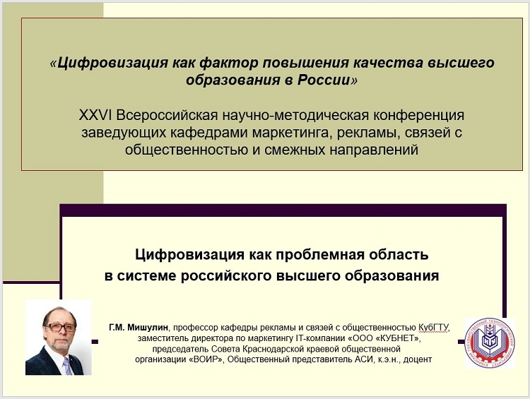 29 апреля с докладом «ЦИФРОВИЗАЦИЯ КАК ПРОБЛЕМНАЯ ОБЛАСТЬ В СИСТЕМЕ РОССИЙСКОГО ВЫСШЕГО ОБРАЗОВАНИЯ» выступил МИШУЛИН ГЕОРГИЙ МАРКОВИЧ, председатель Совета Краснодарской краевой общественной организации «ВОИР», заместитель директора по маркетингу IT-компании «ООО «КУБНЕТ», профессор кафедры рекламы и связей с общественностью КубГТУ, Общественный представитель АСИ, к.э.н., доцент.
