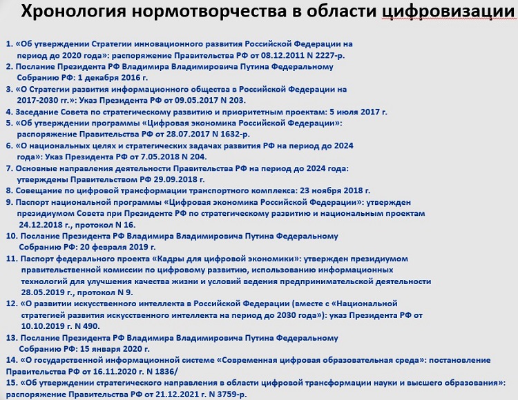 Докладчик проиллюстрировал хронологию программных документов и заявлений руководства страны в области цифровизации за 11-летний период.