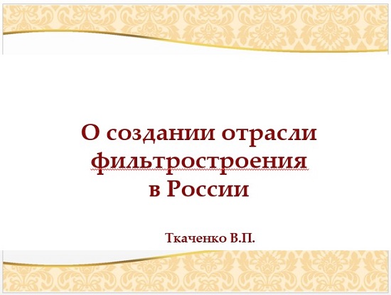 - «О создании отрасли фильтростроения в России» (автор проекта - доктор технических наук ТКАЧЕНКО ВАЛЕНТИН ПЕТРОВИЧ).