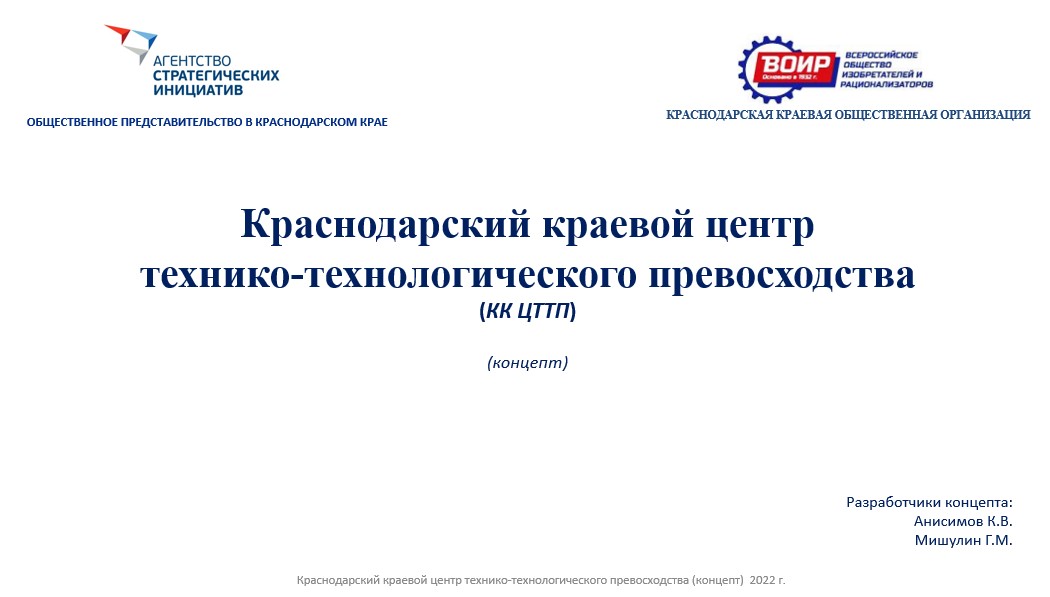 - «Центры технико-технологического превосходства» (автор-руководитель проекта, руководитель управления интеграции инноваций Промышленной Группы «Тегас», заместитель председателя Краснодарской краевой общественной организации «Всероссийское общество изобретателей и рационализаторов» АНИСИМОВ КОНСТАНТИН ВИКТОРОВИЧ). Обозначив уникальность создаваемой организации - её ориентированность не на поддержку проектной заявки, а на организационно-ресурсное сопровождение проекта на всех стадиях его жизненного цикла с последующим направлением части полученной от коммерциализации продуктов проекта прибыли на циклическую работу организации по поддержке и реализации проектов на более высоком уровне за счет эффекта накопления компетенций - К.В. Анисимов смог вызвать интерес присутствующих в зале экспертов, которые увидели в таком подходе возможность создания условий для решения ключевой задачи развития - внедрение в производственные процессы прорывных технологий и получения конкурентоспособных продуктов как ответ на технико-технологические запросы отраслей. Центр планируется создать на базе Краснодарской краевой общественной организации ВОИР.