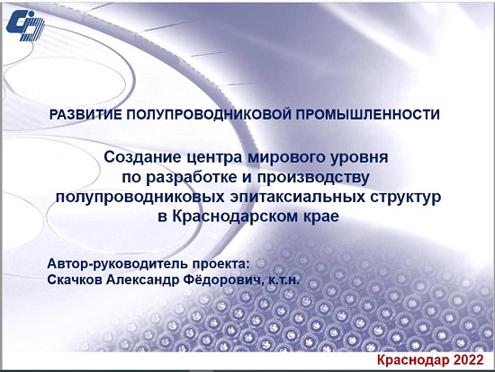 - «Развитие полупроводниковой промышленности. Создание центра мирового уровня по разработке и производству полупроводниковых эпитаксиальных структур в Краснодарском крае» (автор-руководитель проекта - СКАЧКОВ АЛЕКСАНДР ФЕДОРОВИЧ, заместитель директора АО «Сатурн» по научной работе, кандидат технических наук, член ККОО ВОИР). Точная и лаконичная оценка значимости этого проекта была дана в выступлении члена экспертного совета ККОО ВОИР, Заслуженного работника транспорта Кубани, члена экспертно-консультационного совета при комитете ТЭК, транспорта и дорожного хозяйства Законодательного Собрания Краснодарского края ЛЕОНИДА НИКОЛАЕВИЧА ЛЕБЕДЯ.